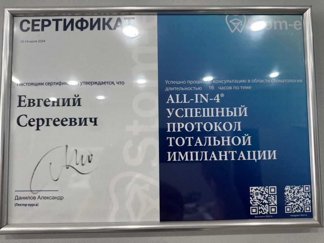 Недавно была в клинике на приеме, где мне провели консультацию и коррекцию верхнего протеза с оптимальным для меня результатом. Особенно хочу отметить доктора Евгения Сергеевича - очень внимательный и компетентный специалист. С уверенностью могу рекомендовать его всем!