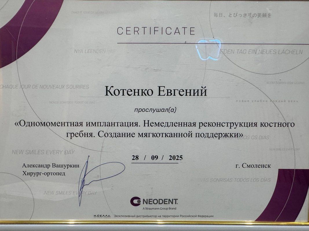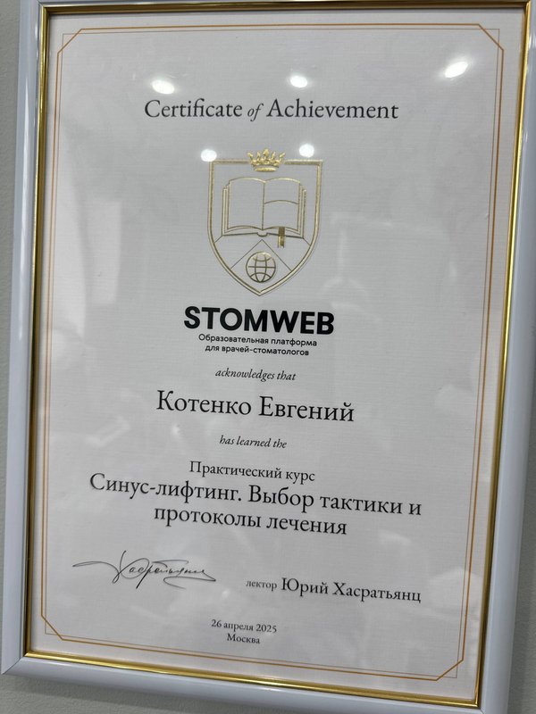 От посещения клиники остались очень приятные впечатления! Врач-имплантолог Евгений Сергеевич Котенко - опытный, спокойный и уравновешенный специалист, что для меня очень важно. Нервозность и суета других врачей часто сказываются на лечении, а здесь я чувствовался комфорт и уверенность. Цена на имплантацию также порадовала. Все понравилось, я планирую продолжать лечение здесь.